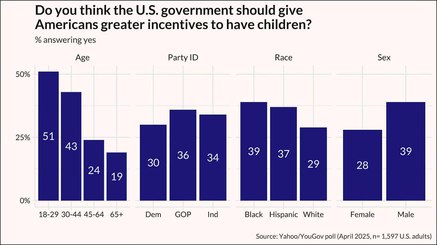 “As this survey suggests, pro-natal policies may be received best if they are seen as supporting parents rather than trying to induce people to have children. This survey is just the latest to hint that Americans need to be educated about the social and economic consequences of a low fertility future, and that some pro-family policies have the ability to capture some eyeballs—and maybe even sway some votes.”